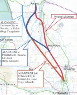 The expected completion of the entire expressway caused a major delay when an unsolicited proposal was brought up to change the alignment of the project to change the location of the final interchange in Rosario, La Union.[34][35][36] Former Pangasinan 5th District Representative Mark Cojuangco proposed three alignments: one would pass through Urdaneta City, then San Fabian, and exits Brgy. Cataguintingan of Rosario, La Union. This is about 1.48 kilometers (0.92 mi) longer from the original TPLEX terminus at barangay Subusob, Rosario. The second proposal will also pass through San Fabian but will end at the original TPLEX end at barangay Subusob. The first two proposals skips Pozorrubio. The third proposal will pass through Pozorrubio, San Fabian, and then end at barangay Subusub. All proposals intend to skip the municipality of Sison. The Cordillera Administrative Region Development Council has rejected the idea.[37] The target completion date had been moved from the end of April 2017 to the end of April 2018.[38]