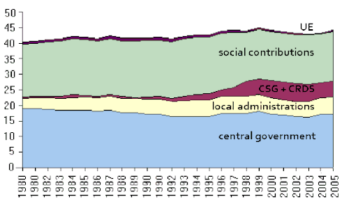 In this context, the structure of the funding of the social security administrations has been more and more assured by taxes rather than social contributions. In particular, new taxes were levied to help fund the social security administrations, such as the general social contribution (CSG) and the contribution for the repayment of the social debt (CRDS). More recently, the central government has helped to fund the social security administrations by the revenues from the excise on alcohol and tobacco, in part to offset reductions in social contributions. As for the growth of the revenues for the benefit of local administrations, it is only due to the devolution, begun with the 1992 laws, and continued with the reforms in 2003.