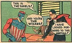The first team-up between characters published in different comics from the same publisher was published in 1940 by the MLJ Comics. Pep Comics #4, by Harry Shorten and Irv Novick, featured a story with the Shield, which was continued in Top Notch Comics #5, by Will Harr and Edd Ashe. In that comic, the Shield met the Wizard. Timely Comics would follow, with a team-up between Sub-Mariner and Human Torch. National Comics Publications took the team-up concept one step further and created the Justice Society of America, the first superhero group, composed of superheroes who starred their own comic books.[2] In international comics, the Phantom teamed up with Zigomar in 1939.[3]