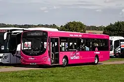 The Holmfirth Explorer operates hourly (two-hourly on Sunday) between Holmfirth and Wakefield via Denby Dale. It encompasses five former services into a single "easy to follow" service.[43] The service is operated by a fleet of Optare Tempo single-deck vehicles, branded in a two-tone pink livery. Features include free WiFi, USB charging and audio-visual next stop announcements.