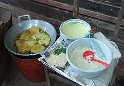 The term tempe is thought to be derived from the Old Javanese tumpi, a whitish food made of fried batter made from sago or rice flour which resembles rempeyek.[5] The historian Denys Lombard also suggests that it could be linked to a later term tape or tapai which means 'fermentation'.[6]