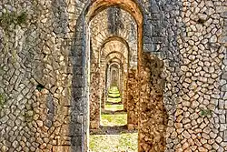 The temple was built between the mid-second and mid-first century BC and is dedicated to Jupiter, who was the protector of Anxur.[2] It was located along the Via Appia which passed through the city of Terracina and is situated atop Mount Sant’Angelo. The site is erected on top of a terraced platform that uses opus incertum. The largest temple is dedicated to Jupiter while a smaller temple dedicated to Venus Obsequens ("Indulgent Venus") sat next to it. After the Roman period, the sanctuary was destroyed.[3] The remains were known in the medieval times as “Theodoric’s palace,” and in the early Middle Ages, a monastery dedicated to St. Michael the Archangel occupied the smaller temple. The interior was transformed into a church, and 9th-century frescos can still be found inside. The first excavations of the temple date to 1894 by Pio Capponi.[4]