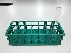 Test tube racks are laboratory equipment used to hold upright multiple test tubes at the same time. They are most commonly used when various different solutions are needed to work with simultaneously, for safety reasons, for safe storage of test tubes, and to ease the transport of multiple tubes. Test tube racks also ease the organization of test tubes and provide support for the test tubes being worked with.[1]