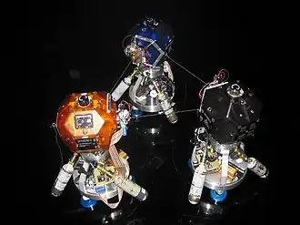 The MIT Space Systems Laboratory[2] conducted ground experiments that tested a fully decentralized nonlinear control law, which eliminates the need for inter-satellite communications.[3] Contraction theory[4] was used to prove that a nonlinear control law stabilizing a single-tethered spacecraft can also stabilize arbitrarily large circular arrays of tethered spacecraft, as well as a three-spacecraft inline configuration. In order to validate the effectiveness of the decentralized control and estimation framework, a new suite of hardware has been designed and added to the SPHERES (Synchronize Position Hold Engage and Reorient Experimental Satellite) testbed. A 2007 PhD thesis introduced a novel relative attitude estimator, in which a series of Kalman filters incorporate the gyro, force-torque sensor, and relative distance measurements.[5] The closed-loop control experiments can be viewed at .[6] The MIT team also reported the first propellant-free underactuated control results for tethered formation flight. This is motivated by a controllability analysis that indicates that both array resizing and spin-up are fully controllable by the reaction wheels and the tether motor.[7][8]