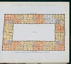 Originally, servants' rooms, bedrooms, and family rooms were generally separated.[30] Each apartment was 50 feet (15 m) deep, facing both the street and the courtyard.[14][26][12] Many apartments had a library, dining room, and parlor.[12] The bedrooms and servants' rooms typically faced the courtyard,[25][27] which was wider than the neighboring section of 86th Street.[19] Family rooms such as living rooms, parlors, dining rooms, and kitchens faced the street.[25] In general, each apartment was accessed by a large foyer.[25][38] The foyer led to a parlor and dining room that were connected to one another. A kitchen, butler's pantry, and servants' bedrooms were next to the dining room. Another corridor led perpendicularly from the foyer to the bedrooms.[25] On average, each apartment had two to four bathrooms and two or three servants' bedrooms.[48] Each apartment also had large closets.[30][38]