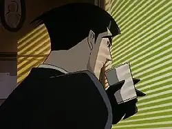 Roger Smith is a pastiche of the Bruce Wayne persona and the Batman. The character design resembles Wayne, complete with slicked-back hair and double-breasted business suit.[32] Like Bruce, Roger prides himself in being a rich playboy to the extent that one of his household's rules is only women may be let into his mansion without his permission.[25] Like Batman, Roger Smith carries a no-gun policy, albeit more flexible. Unlike the personal motives of the Batman, Roger enforces this rule for "it's all part of being a gentleman."[33] Among Roger's gadgetry is the Griffon, a large, black hi-tech sedan comparable to the Batmobile, a grappling cable that shoots out his wristwatch and the giant robot that Angel calls "Roger's alter ego."[19][34]