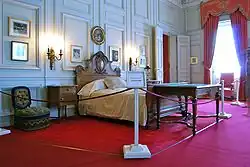 Guest bedroom – This room exemplifies the Louis XVI style through furniture, woodwork and light fixtures, with Neoclassical style abounding in the interior. The wall paneling has never been retouched, though the rest of the room has been restored by the preservation society.