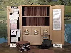 The project was devised as a protest at the closure of the original Bristol Art Library.[1][2] The library consists of handmade identically-bound books on a wide range subjects produced by individual contributors from all areas of the arts and sciences, each catalogued according to the Dewey Decimal System. The books are contained within a small wooden cabinet and made available when Other "performs" the library in the guise of the Head Librarian. Although TBAL is primarily an artistic endeavour, it borrows the rhetoric of, and operates as a public institution with affiliations to official library organisations worldwide. Readers must fill in appropriate application forms, and adhere to strict library rules whereupon the books can be read using a reader's ticket whenever the library is open for lending.