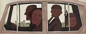 The Car is a 1955 painting by Australian artist John Brack. The painting depicts a family in a car on a drive in a rural area. The painting shows the father looking at the road ahead while the mother and children look towards the viewer.[1] While the whole car cannot be seen, the car itself is identifiable as a Triumph Mayflower.[1] The landscape, seen through the windows of the car, has been said to be inspired by the work of his contemporary Fred Williams.[2]