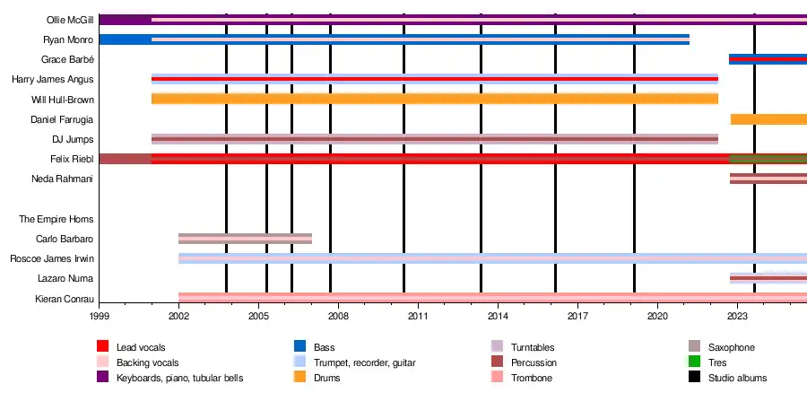 In August 2022, the band began to announce the first shows with a new lineup via their Facebook page, as well as teasing new music, with new band members being announced starting in September.[74] New members announced include Grace Barbé on bass and vocals, Neda Rahmani on percussion, former touring member Daniel Farrugia on drums, and Lazaro Numa joining The Empire Horns on trumpet and percussion.