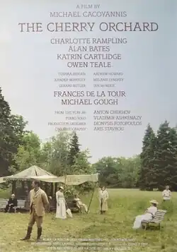 The Cherry Orchard is a 1999 period drama film directed and written by Michael Cacoyannis, and starring Charlotte Rampling, Alan Bates, Katrin Cartlidge, and Owen Teale. The supporting cast includes Xander Berkeley, Gerard Butler, Melanie Lynskey, and Frances de la Tour. It is based on the 1904 play The Cherry Orchard by Anton Chekhov, and was an English-language co-production between Cyprus, France and Germany.