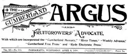 The Cumberland Argus and Fruitgrowers' Advocate (also known as The Cumberland Argus or The Argus) was a newspaper published in Parramatta with coverage and circulation incorporating Greater Western Sydney and parts of North-West Sydney, Australia. First published on 24 September 1887, the paper continued under this title until issue No. 3397, on 15 March 1950, when the newspaper was officially renamed the Cumberland Argus. It remained under this banner for a further 12 years until it ceased publication on 24 October 1962.