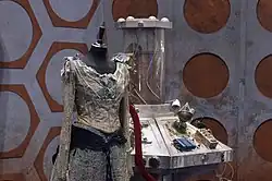 Idris' costume, and the makeshift TARDIS set, on display at the Doctor Who Experience.