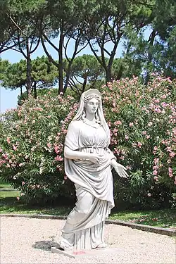 The Temple of Jupiter was constructed on a 29-metre (95 ft) high hill along the plains of Las Matas by which craftsmen built the 50-metre (160 ft) temple on it. The bronze equestrian figures at the top of the temple were 24 metres (79 ft) above the pavement of the forum set. For the statuary, 350 statues had to be constructed. There were 76 life-size statues, more than a thousand sculpted bases for the remaining figures and victory columns, and a series of the aforementioned equestrian statues that were 7.6 metres (25 ft) high. Ultimately, more than 3,000 sketches were drawn to illustrate the 27 structures that would comprise the sets.[34] The various ancient Rome settings covered 22 hectares (54 acres).[35] After much of the set was pulled down, the remaining sections were reused in A Funny Thing Happened on the Way to the Forum (1966).[36]