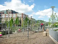 The urban park in northwest Portland's Pearl District consists of a large oval field, an enclosed children's playground, and a fenced-in dog park as well as picnic tables, an earthquake emergency communication node, and a Portland loo restroom. It is part of the 2001 River District Renewal plan to build and link four parks, which also includes Jamison Square and Tanner Springs Park.[2] The Fields Park is the largest of these parks.[3] Its original design included a foot bridge over the nearby railway tracks, connecting to a fourth park on the bank of the Willamette River. This feature was never built and the fourth park has not begun construction.[4][5][6][7]