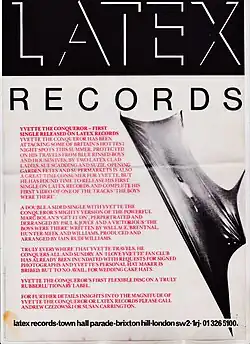 In July 1985, Czezowski and Carrington launched their own Record Company, Latex Records, located at the Fridge. Yvette the Conqueror was the first artist signed to the label. The label's first release was a single by Yvette the Conqueror, titled "The Boys Were There",[8] produced by Iain 'Rudi' Williams (from the bands You You You and Big Bang).[9] Czezowski and Carrington also promoted many bands at the Fridge, one of which was the cult club-band You You You featuring club promoter Laurence Malice, Karen O'Connor and Iain 'Rudi' Williams. The band performed a sell-out concert at the Fridge on 27 March 1987, at which Czezowski had a huge white staircase built on the stage for the band to perform on.[10][11] The show was filmed for Japanese television. Since then it has hosted a variety of club nights most notably Soul II Soul (1988 - 1993) Daisy Chain (1987-1990) and Escape From Samsara (1995-2005).