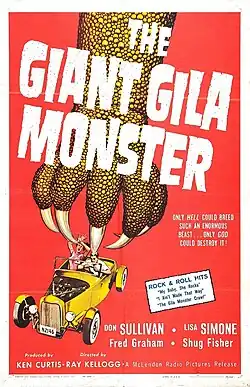 The Giant Gila Monster is a 1959 American monster film directed by Ray Kellogg and produced by Ken Curtis. A famous B-movie of the era, the film stars Don Sullivan, a veteran of several low budget monster and zombie films, and Lisa Simone, the French contestant for the 1957 Miss Universe, as well as comedic actor Shug Fisher and KLIF disc jockey Ken Knox. The effects included a live Mexican beaded lizard, instead of a Gila monster, that was filmed on a scaled-down model landscape.