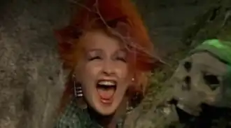 Soon after, they encounter a group of pirates (who look just like the creditors, though it is never said if they are the same people as the creditors), and a supposed green-faced witch. Cyndi runs away as the Goonies are captured by the pirates. Running through the caverns, she encounters several skeletons and even some chefs who seem to work for the restaurant Benihana. Cyndi eventually finds herself trapped between the pirates and the green-faced witch on a log bridge. Unsure what to do, she cries out "Steven Spielberg, how do I get out of this one?" The scene cuts to Spielberg in an editing room, apparently in the midst of editing the video as it is happening. Spielberg stops the editing machine and begins to give a solution, before realizing that he does not know how to help Cyndi.