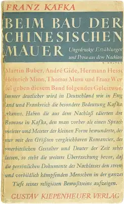 The Great Wall of China (German: Beim Bau der Chinesischen Mauer [While building the Chinese wall]) is the first posthumous collection of short stories by Franz Kafka published in Germany in 1931. It was edited by Max Brod and Hans-Joachim Schoeps and collected previously unpublished short stories, incomplete stories, fragments and aphorisms written by Kafka between 1917 and 1924. The first English translation by Willa and Edwin Muir was published by Martin Secker in 1933. The same translation was published in 1946 by Schocken Books.