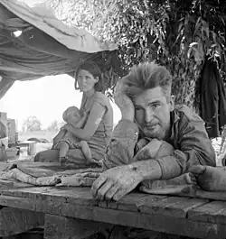 Steinbeck pays great attention to highlight how the Depression has impacted the families in the squatter camps by tracing their economic degeneration, and the intense precision and consistency that their agricultural work demands.[39] He mentions a family that had been very successful farmers,[40] and another that had owned a grocery store.[41] Additionally, he notes the tempered optimism that many new residents had, and works to humanize the squatters: their desire to educate their children, and the loss of loved ones that marks their lives evoke sympathy. With the "filth"[42] and malnutrition of the camps, causes of death are clear to Steinbeck—and, he purports, to the squatters.[43]