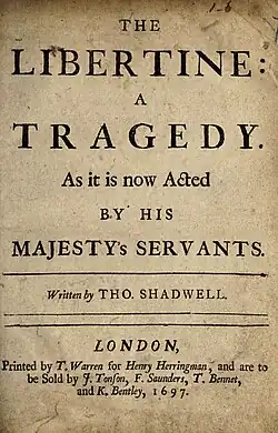 The Libertine is a play by Thomas Shadwell published in 1676. The play is an adaptation of the original plot of El burlador de Sevilla, written by Tirso de Molina, which follows the story of a horrid womanizer who plays with his life and others as he commits sins and "shapeshifts" into a devil-like man. Like most of the adaptations, The Libertine is a story of a mischievous man condemned to pay for the actions of his sins.
