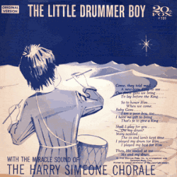 The album and the song were an enormous success,[13] with the single scoring in the top 40 of the U.S. music charts from 1958 to 1962.[10] In 1965, Simeone, who had signed with Kapp Records in 1964, re-recorded a new version of the song for his album O' Bambino: The Little Drummer Boy.[14] This version (3:18 play time) was recorded in stereo, had a slightly slower tempo, and contained different-sounding cymbals. Simeone recorded the song a third and final time in 1981 (3:08 play time), for an album, again titled The Little Drummer Boy, on the budget Holiday Records label.