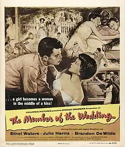 The Member of the Wedding is a 1952 American film noir drama film directed by Fred Zinnemann and starring Ethel Waters, Julie Harris, and Brandon deWilde. The story, based on Carson McCullers' 1946 novel of the same name, is set in a small town in the Southern United States. Frankie Addams is an awkward, moody 12-year-old tomboy whose only friends are her young cousin John Henry and her black housekeeper Berenice. Co-starring as a drunken soldier who tries to take advantage of the vulnerable Frankie is former child actor Dick Moore, making his last film appearance.