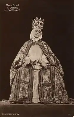 Although some advertising for the film implied that all the cast had been in the 1911–12 Olympia production, this was only true for Maria Carmi, Douglas Payne, Ernst Benzinger and Joseph Klein. Carmi was married to Karl Vollmoeller, the author of the stage play, and The Miracle was the first of her 26 films. Apart from Payne and Matray, who had made one film each, none of the cast had any experience in film acting; between them Carmi, Matray, Payne, Benzinger and Klein went on to make some 160 motion pictures[10] Carmi, Matray, Klein and Rocholl also starred in the film of Vollmoeller's next pantomime, Eine venezianische Nacht (A night in Venice).[11]