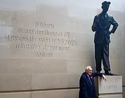 On 7 November 2017, a statue of Orwell sculpted by Martin Jennings, was unveiled outside Broadcasting House. The idea for the statue and its location came from Ben Whitaker MP who created a Trustee Board of distinguished people to raise the money. Following Ben Whitaker's death in 2014, the fund raising was completed by his widow Baroness Janet Whitaker and the sculpture was commissioned after securing the commitment of the BBC.[23] Baroness Whitaker and Richard Blair delivered short speeches before unveiling the Statue. The wall behind the statue is engraved with the words: "If liberty means anything at all, it means the right to tell people what they do not want to hear", a quote attributed to Orwell's proposed preface to Animal Farm.[24] Baroness Whitaker and the Trustee Board invited The Orwell Society to take over ownership of the Statue. The handover was completed in 2021.[25]