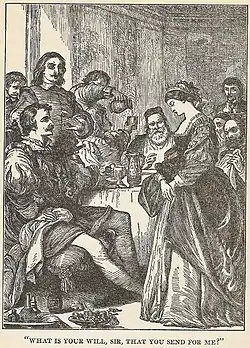 In 1890, Alfred Tolman conjectured a possible literary source for the wager scene may have been William Caxton's 1484 translation of Geoffroy IV de la Tour Landry's Livre pour l'enseignement de ses filles du Chevalier de La Tour Landry (1372). Written for his daughters as a guide on how to behave appropriately, de la Tour Landry includes "a treatise on the domestic education of women" which features an anecdote in which three merchants make a wager as to which of their wives will prove the most obedient when called upon to jump into a basin of water. The episode sees the first two wives refuse to obey (as in the play), it ends at a banquet (as does the play) and it features a speech regarding the "correct" way for a husband to discipline his wife.[b][10] In 1959, John W. Shroeder conjectured that Chevalier de La Tour Landry's depiction of the Queen Vastis story may also have been an influence on Shakespeare.[11]