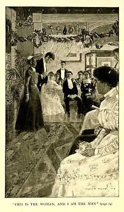 At the ball Ryder addresses the members and tells them 'Liza Jane's story. At the conclusion, he asks the attendees whether or not they think the man should acknowledge his wife. Everyone urges yes. He brings out 'Liza and says, "Ladies and gentlemen, this is the woman, and I am the man, whose story I have told you. Permit me to introduce to you the wife of my youth."