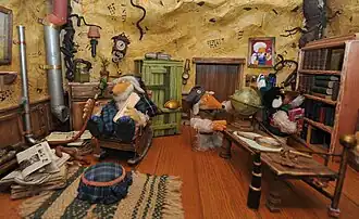 Wombles care for and educate their young at a communal level. As with human children, immature Wombles are taught reading, writing and athletic skills, which they learn by playing a game called "Wombles and Ladders". Some older Wombles play this game too, though most regard it as childish. Below a certain (unspecified) age, all Wombles are nameless; upon being deemed to be of working age, a Womble chooses his or her name by looking through Great Uncle Bulgaria's large atlas until they find a name that suits them. Some, Bungo for example, "merely shut their eyes tight and point and hope for the best".[8] They then leave Miss Adelaide's "Womblegarten" and join in the communal work of the burrow, which is mostly clearing up and recycling human refuse.