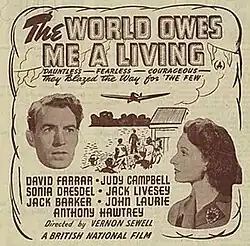 The World Owes Me a Living is a 1945 British Second World War drama film directed by Vernon Sewell and starring David Farrar and Judy Campbell.[1][2] It was written by Sewell and Irwin Reiner based on the novel of the same title by John Llewellyn Rhys, a young author who was killed in action in 1940 while serving in the Royal Air Force. Its credits acknowledge the assistance and co-operation of the Air Ministry and the de Havilland Aircraft Company.