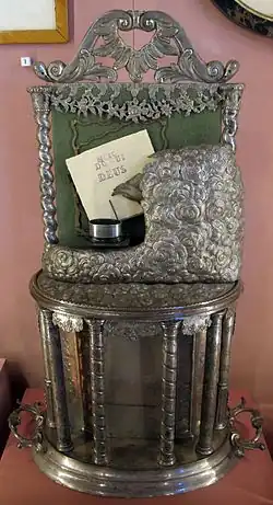 The writing hand is a mechanical automaton created by Friedrich von Knauss in 1764.[1][2] A clockwork mechanism moves a hand which dips a pen into an inkstand and writes the phrase "Huic Domui Deus / Nec metas rerum / Nec tempora ponat" ("May God not impose ends or deadlines on this house") on a small card.[3] On the silver-coating of the mechanism are the words "Pro patria".