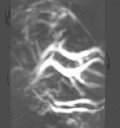 In order to capture sufficient thermoacoustic data to form an accurate 3D map of electromagnetic absorption, it is necessary to surround the anatomy being imaged with a 2D array of transducers. The world's first 3D thermoacoustic animal scanner (Fig. 8: left panel) accomplished this by combining a cylindrical array of 128 transducers (Fig. 8: center panel) with rotation of the animal being imaged about the vertical axis. The net result was to capture thermoacoustic data over the surface of a sphere surrounding the animal being imaged (Fig. 8: right panel).[21] This device was capable of visualizing structures as small as 1/3 millimeter. An animated 3D image of the vasculature in the head of a mouse is displayed in Fig. 9. This animated image was acquired using near infrared radiation at 800 nm, where optical absorption by blood is higher than surrounding tissues. Therefore, the vasculature is preferentially visualized.