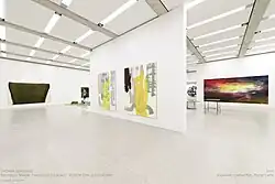 Reinhold’s large-scale oil paintings address such issues as medium reflexivity, the material dimension of paint, or the canvas plane and its relation to space. The paintings deal with questions of their own creation and their relation to time by showing overlapping layers of colour.[4] Because of this, the beholder needs to see the paintings in an almost archaeological way to explore the pictorial space. In 2011, Reinhold worked on the series “Tectonics of Poise“. The subject of this group of works reflects on their own creation. Liquid paint coalesces around a dead centre, permitting – for a few moments – a process of ordered decision making. The painting procedure, in which the allocation of the centre of gravity is such an essential element, actually provokes this fleeting state where indeterminacy gives way to form. It is this point of transition that attracts attention and produces shapes seemingly suspended between rivulets.