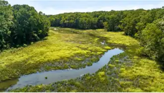 Freshwater tidal marshes live more inland than saltwater marshes, but their proximity to the coast still allows for daily fluctuations from tides.[8] The inland location allows for a majority of the water content to be from freshwater stream discharge, meaning the salt content is low.[8]
