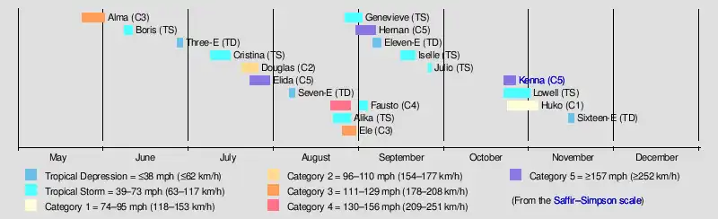 Nineteen tropical depressions developed during the 2002 season, with fifteen further strengthening into named tropical storms;[nb 1] eight became hurricanes, of which six attained major hurricane status.[nb 2][2][3]: 2379 Activity was generally near normal, with the number of tropical storms and hurricanes matching the respective 1991–2020 averages; however, the number of major hurricanes was above the average of four for the same period.[1][3]: 2379 Hurricanes Elida, Hernan, and Kenna achieved Category 5 strength on the Saffir–Simpson scale, tying a record set in 1994 for the most storms to do so in one season since reliable records began in 1971.[4]