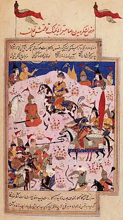 In 1383, taking advantage of Timur's preoccupation with affairs in Persia, Tokhtamysh restored the Golden Horde's authority over the semi-autonomous Ṣūfī Dynasty in Khwarazm, apparently without provoking his former patron.[20] Under pressure from his emirs to provide profitable campaigns for plunder and perhaps possessed by the traditional ambitions of his predecessors, Tokhtamysh crossed the Caucasus with a large force (5 tumens, 50,000 troops) during the winter of 1384–1385, invading Jalayirid Azerbaijan. He captured the capital, Tabriz, by storm and ravaged the neighboring area for ten days, before retiring with his plunder, including some 200,000 slaves, among them thousands of Armenians from the districts of Parskahayk, Syunik, and Artsakh.[21] Either to take advantage of Jalayirid weakness or to preempt the expansion of the Golden Horde into the area, Timur proceeded to conquer Azerbaijan in 1386. He was wintering in nearby Karabakh in 1386–1387, when Tokhtamysh crossed the mountains in the spring of 1387 and headed straight for him. Despite being taken by surprise and being nearly defeated, Timur's commanders rallied and succeeded in repelling Tokhtamysh's attack with the help of timely reinforcements led by Timur's son Mīrān Shāh. Timur showed remarkable leniency to the captured warriors of Tokhtamysh, feeding and clothing them and allowing them to return home. Whether this was a sign of respect toward a royal descendant of Chinggis Khan or an attempt to defuse an unnecessary conflict on an unwanted front is unclear.[22]