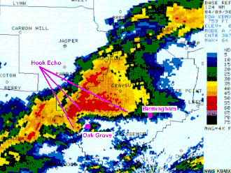 ![]() Radar shot of the Birmingham supercell with the hook echo tornado signature located near Oak Grove. | |