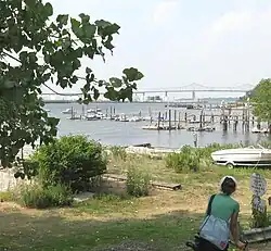 A view of Arthur Kill, the waterway between Staten Island and the New Jersey mainland; the Outerbridge Crossing is in the background