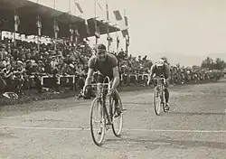 Desgrange and his Tour invented bicycle stage racing.[30] Desgrange experimented with different ways of judging the winner. Initially he used total accumulated time (as used in the modern Tour de France)[31] but from 1906 to 1912 by points for placings each day.[29][n 4] Desgrange saw problems in judging both by time and by points. By time, a rider coping with a mechanical problem—which the rules insisted he repair alone—could lose so much time that it cost him the race. Equally, riders could finish so separated that time gained or lost on one or two days could decide the whole race. Judging the race by points removed over-influential time differences but discouraged competitors from riding hard. It made no difference whether they finished fast or slow or separated by seconds or hours, so they were inclined to ride together at a relaxed pace until close to the line, only then disputing the final placings that would give them points.[29]