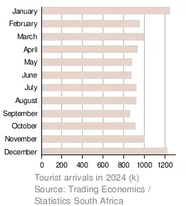In 2024, according to Statistics South Africa (Stats SA), South Africa experienced a growth in tourism numbers, with combined passenger arrivals through its ports of entry increasing to 8.92 million people.[1]