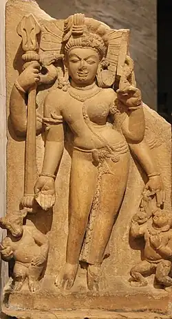 Like many other poses used in traditional Indian dance, including Odissi, Bharata Natyam and Kathak, Tribhangi or Tribhanga can be found in Indian sculpture as well. Traditionally the Yakshi is shown with her hand touching a tree branch, and a sinuous pose, tribhanga pose, as is Salabhanjika, whose examples dating to the 12th century can be found in the Hoysala temples of Belur, in south-central Karnataka and the Khajuraho temples built around 9th century CE, where Vishnu is depicted at various places in this position which is commonly reserved for Krishna, playing the flute.[16][17] The Agamic texts suggest that Shiva sculptures are to be made in tribhanga posture facing the east as seen in temple dating 8th-12th centuries.[18]