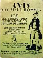 Recruitment affice under Louis XV for the Royal Fusiliers Corps of La Marine.