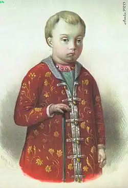 Dmitry was born on 1 November [O.S. 22 October] 1648, the day of the festival of the Mother of God of Kazan icon.[1] He was the first son of Alexis of Russia by his first wife Maria Miloslavskaya, who married the tsar on 16 January (O.S.) the same year.[1] His baptism took place on 29 October, with the officiating priest being Patriarch Joseph.[1] The godmother of the tsarevich was Tsarevna Irina Mikhailovna and the godfather was archimandrite Adrian of the Trinity Lavra of St. Sergius.[1]