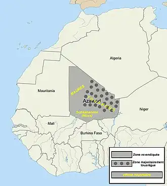 Map of Azawad, as claimed by the MNLA. Dark grey dots indicate regions with a Tuareg majority. | |||||||