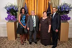 In late 2011, Tuilaʻepa initiated a meeting of Polynesian leaders which led, in November, to the formal launching of the Polynesian Leaders Group, a regional grouping intended to co-operate on a variety of issues including culture and language, education, responses to climate change, and trade and investment in Polynesian countries.[19] The Group was in part a response to the Melanesian Spearhead Group.[20][21][22]