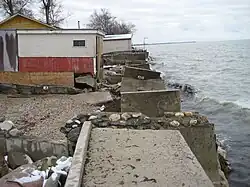 Twin Lakes Beach has been the recipient of many storms causing shoreline erosion, flooding and property damage. Most notably are the storms of the fall of 1999, especially the storm on November 1 [1], as well as the fall of 2010 [2] "weather bomb" both of which involved wind gusts of over 100 km/h and high winds for an extended period of time with the result being a shift in the lake of water from the north basin of Lake Manitoba to the south basin of the lake and large waves. Both storms resulted in considerable shoreline erosion, property damage, and some flooding. The 1999 storm caused an estimated $1 million in damage and was a catalyst for establishing new regulation of lake levels.[5] Also in 1981 and 1992 cottages were destroyed as a result of shoreline ice pile-up. On July 29, 2012 a thunderstorm occurred at Twin Lakes Beach causing widespread damage to property including complete destruction of homes due to heavy rain, hail, and plow winds with gusts up to 150 km/h recorded on radar.[16][17]