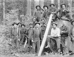 A two-man saw (known colloquially as a "misery whip"[1]) is a saw designed for use by two sawyers. While some modern chainsaws are so large that they require two persons to control, two-man crosscut saws were primarily important when human power was used.[2] Such a saw would typically be 1 to 4 m (4 to 12 feet) long, and sometimes up to 5 m (16 feet), with a handle at each end. In some cases, such as when felling Giant Sequoias, sawblades could be brazed together end-to-end in order to create longer saws.